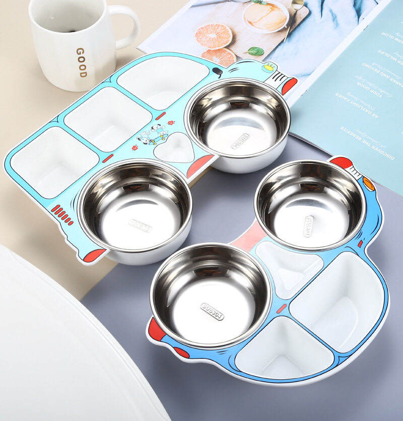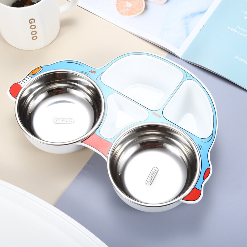 Kocotree Safe stainless steel children's dinner plate 304 stainless steel Cartoon car shape Baby food supplement tableware Anti-scalding partition design Kindergarten gift sets