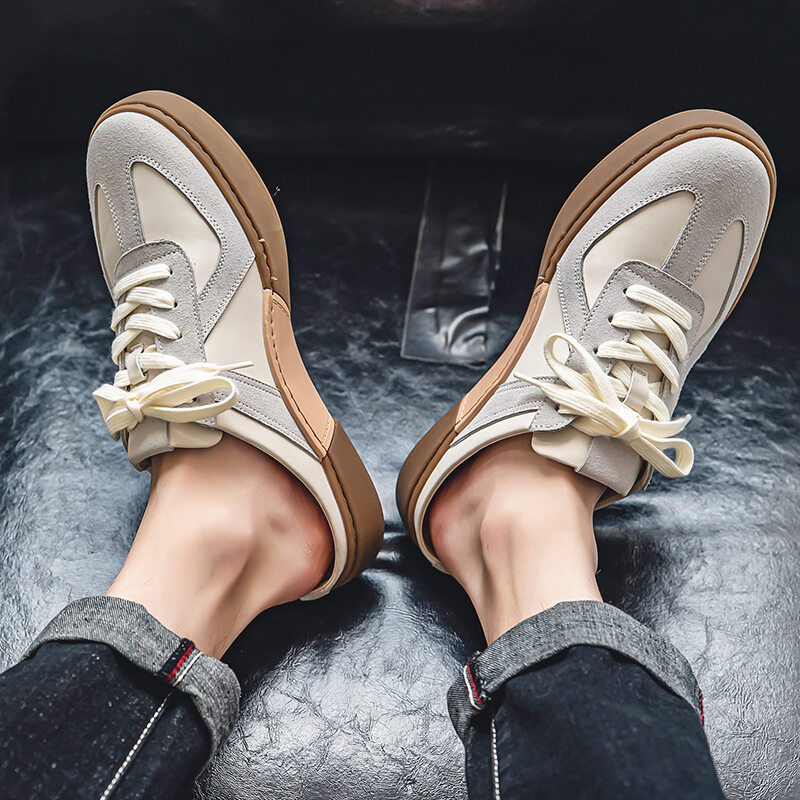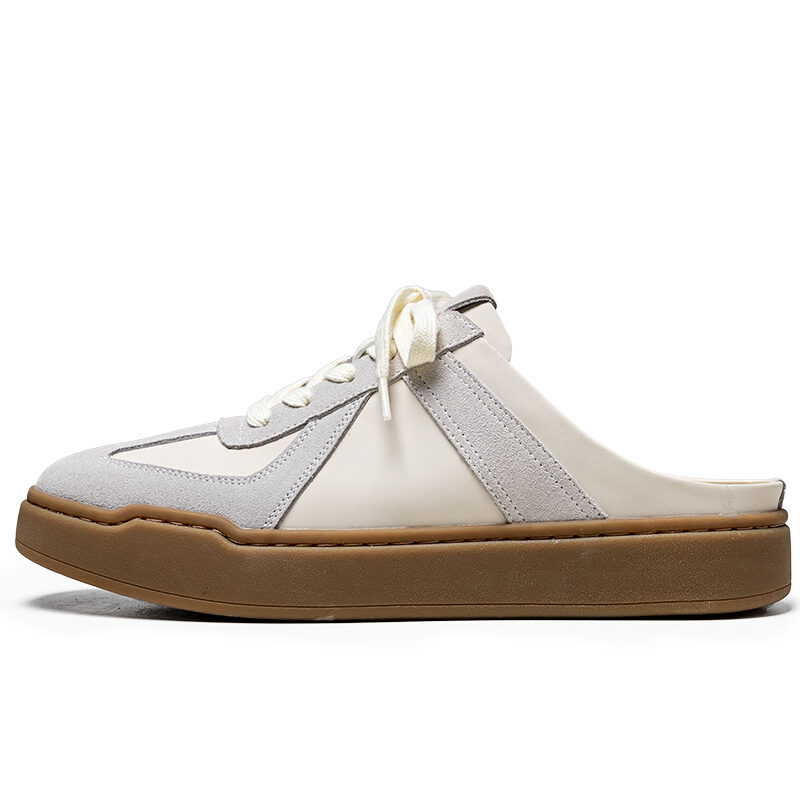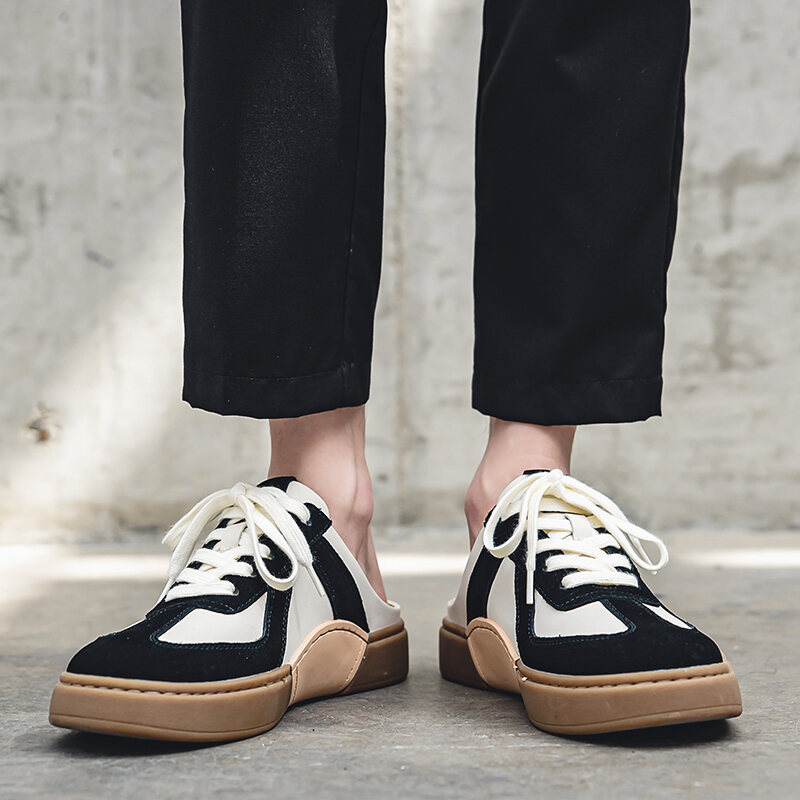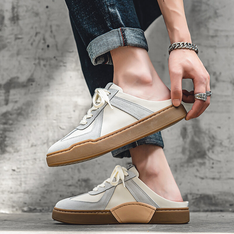Closed Toe Semi Slippers Men's Outer Wear Summer New German Training Genuine Leather Heel-Free Slip-on Platform Loafers