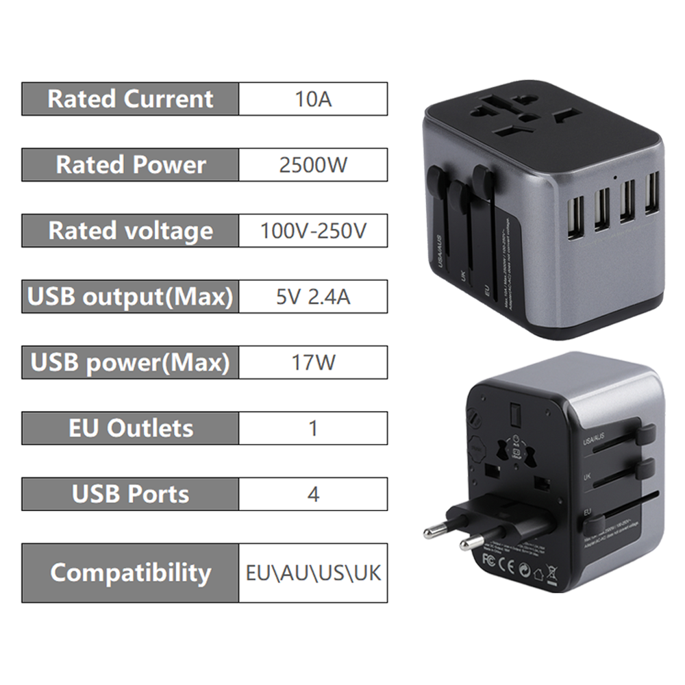 • 5 in 1 Input Universal Outlet Adapter: International adapter plug converter with 4 USB outlet can detect charged devices and deliver optimum fast charging speed up to 2.4A (max) each port for cell phone, power bank etc.(It doesn’t support quick charge). Idea for use at home or hotel as a USB wall plug. Allow you charge up to 5 devices simultaneously