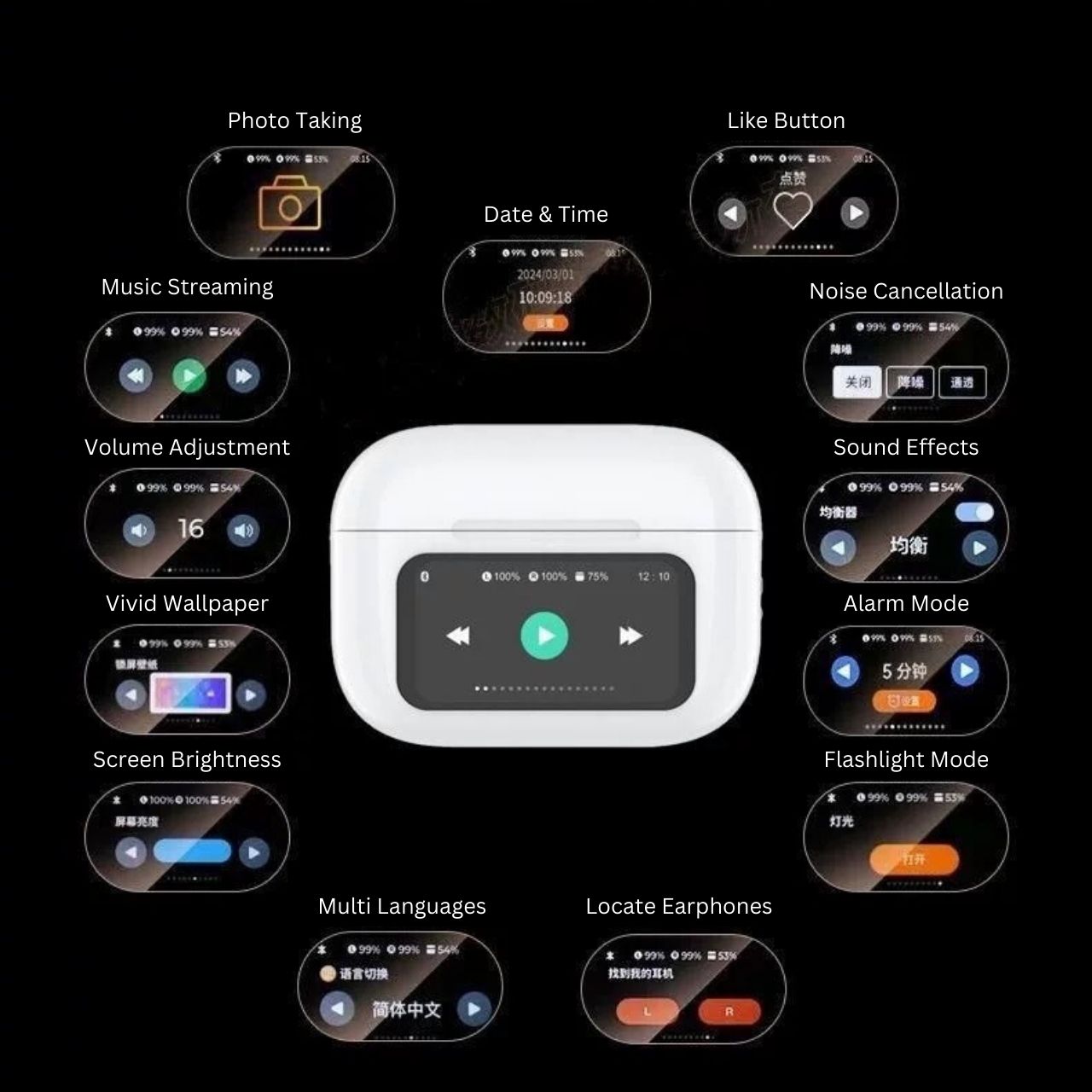 -Charging case power display, left and right ear power display, time display