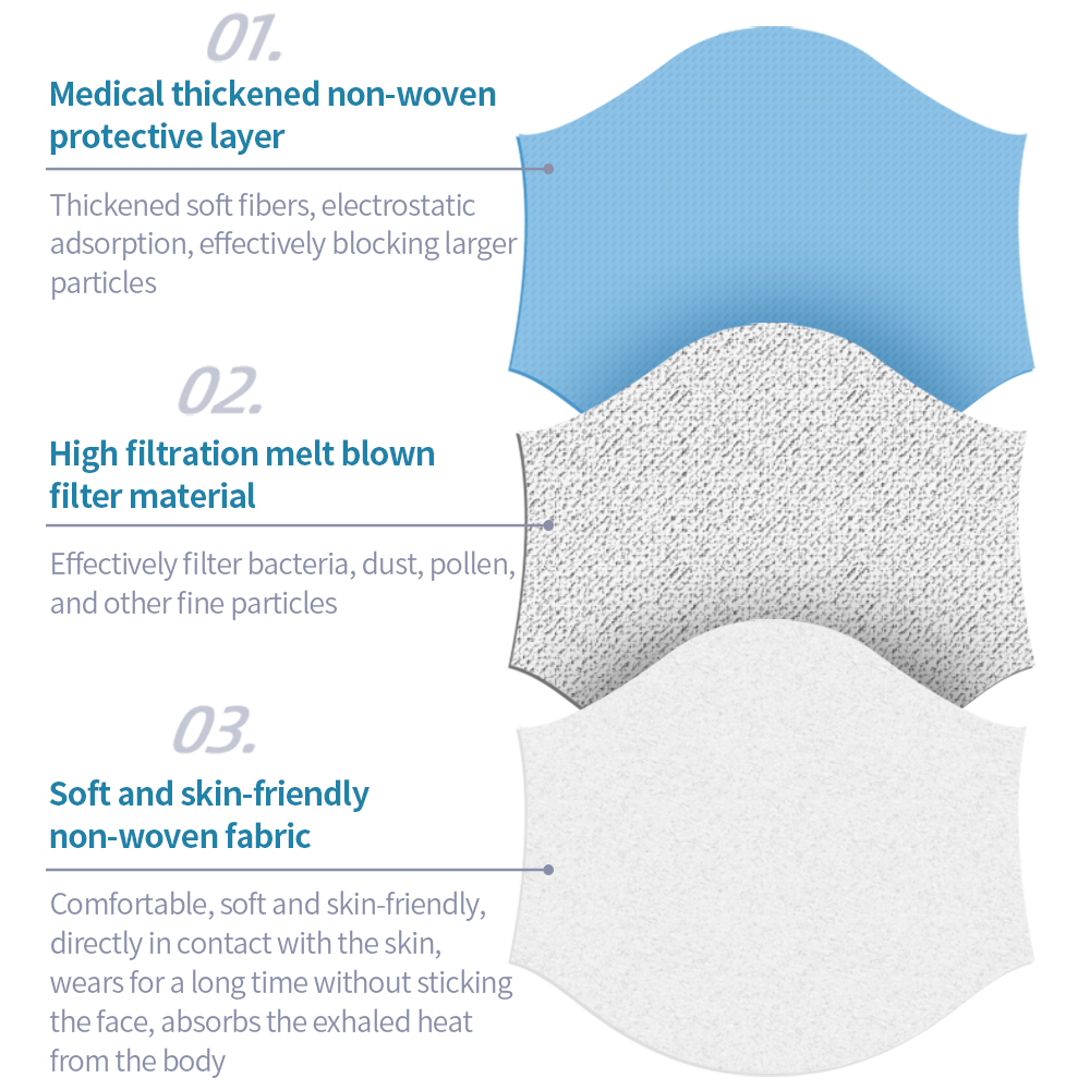 •Specialized nonwoven material structure featuring a three-ply, pleated construction style to optimize lightness of fit, breathability, and fluid resistance