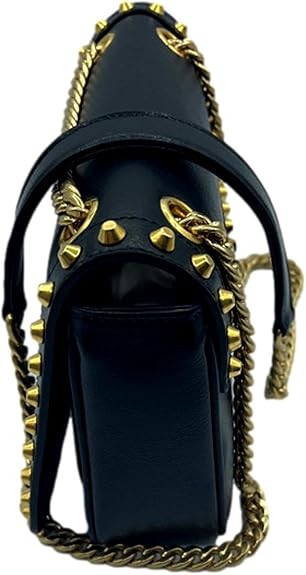 • Color: Black Glace Calf Leather in Nero (Black) Stud Accents Approx 21.5" strap drop. 1 interior zipper pocket 1 interior open slot pocket Magnetic snap button closure